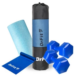 ( ilość produktów: 220 )Niebieski zestaw treningowy - mata NBR, hantle, guma oporowa i gładki roller Travel