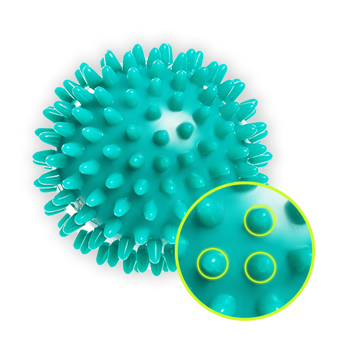 Wypustki znajdujące się na powierzchni piłki stymulują skórę, zwiększając świadomość i odczucia sensoryczne u osób korzystających z nich.