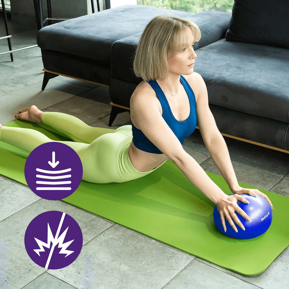 Antypoślizgowa powierzchnia piłki gimnastycznej DrFit zapewnia bezpieczeństwo nawet podczas intensywnych sesji treningowych.