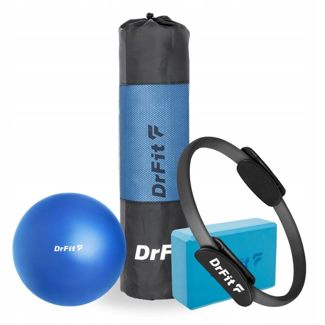 Ten komplet łączy ring do pilatesu o średnicy 36 cm, kostkę do jogi i pilatesu, piłkę do ćwiczeń 25 cm oraz matę 183 x 61 x 0,6 cm.